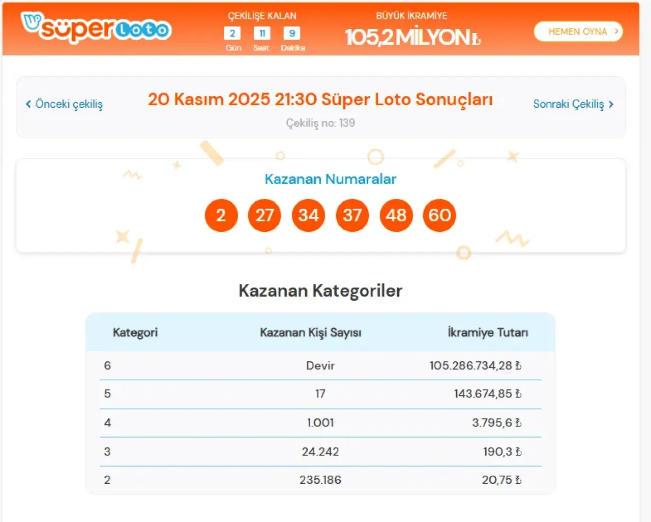 20 Kasım 2025 Süper Loto Sonuçları (Geçmiş Çekiliş)