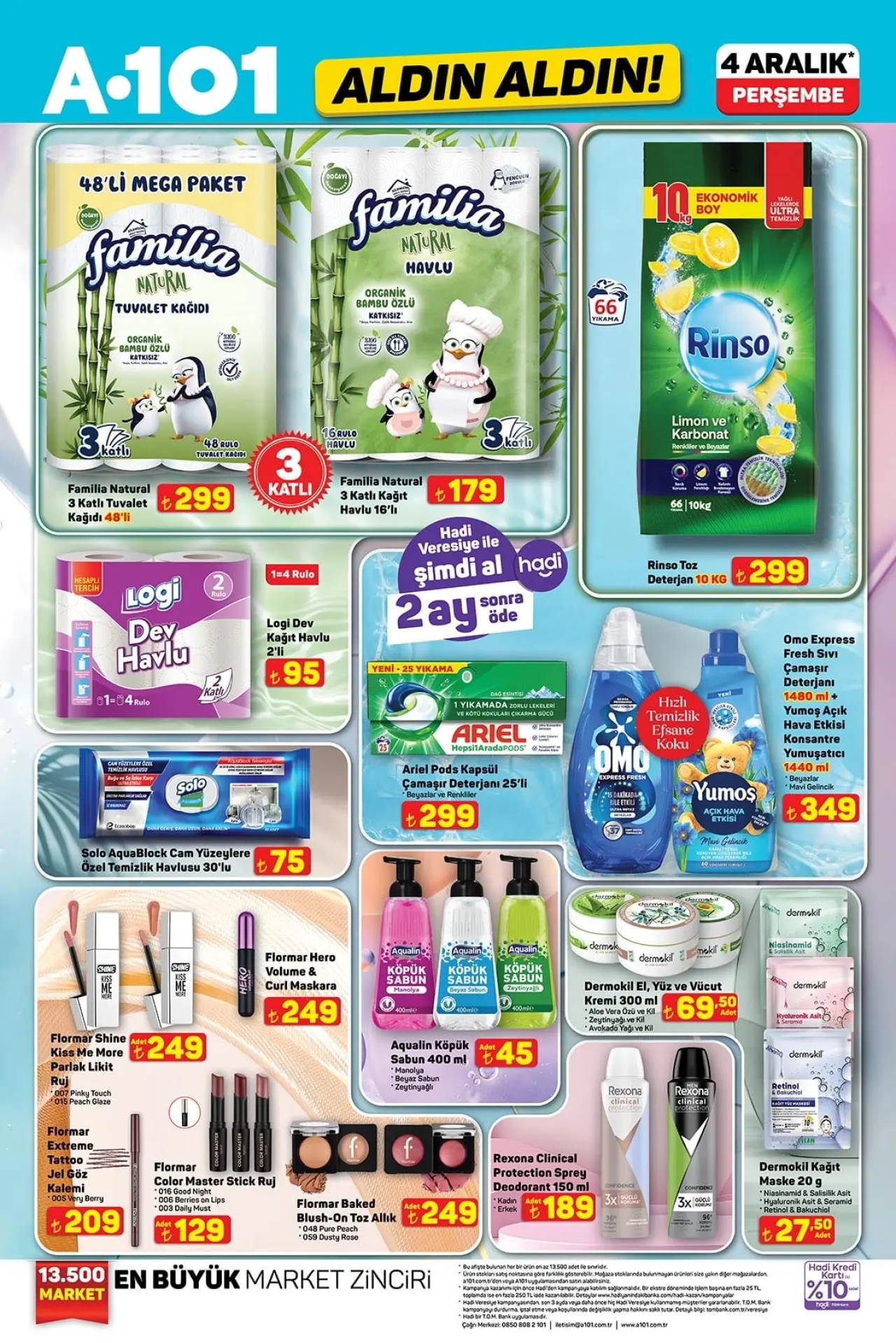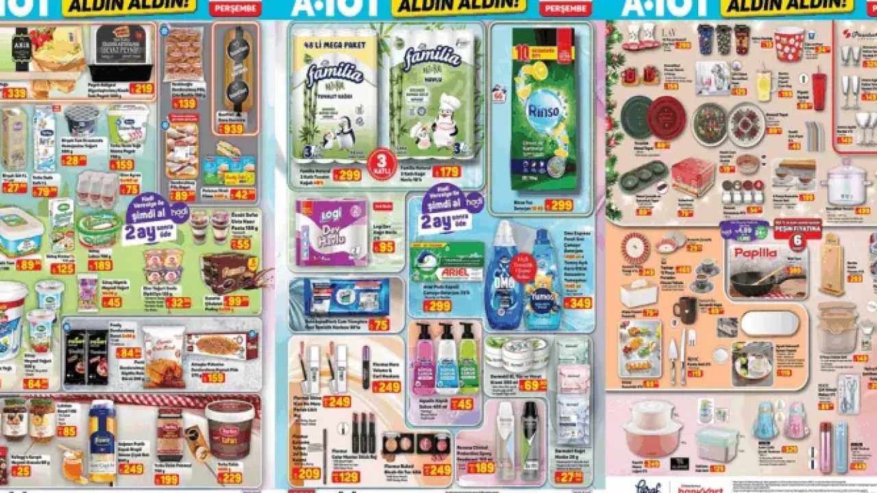 Tuvalet kağıdı, kağıt havlu, toz deterjan, çamaşır deterjanı, yumuşatıcı, küçük sabun, tost peyniri, inek peyniri, çıtır bonfile, kefir, süt ve reçel gibi ürünlerin yer aldığı 4 Aralık tarihinden itibaren geçerli olacak A101 kataloğu yayınlandı.