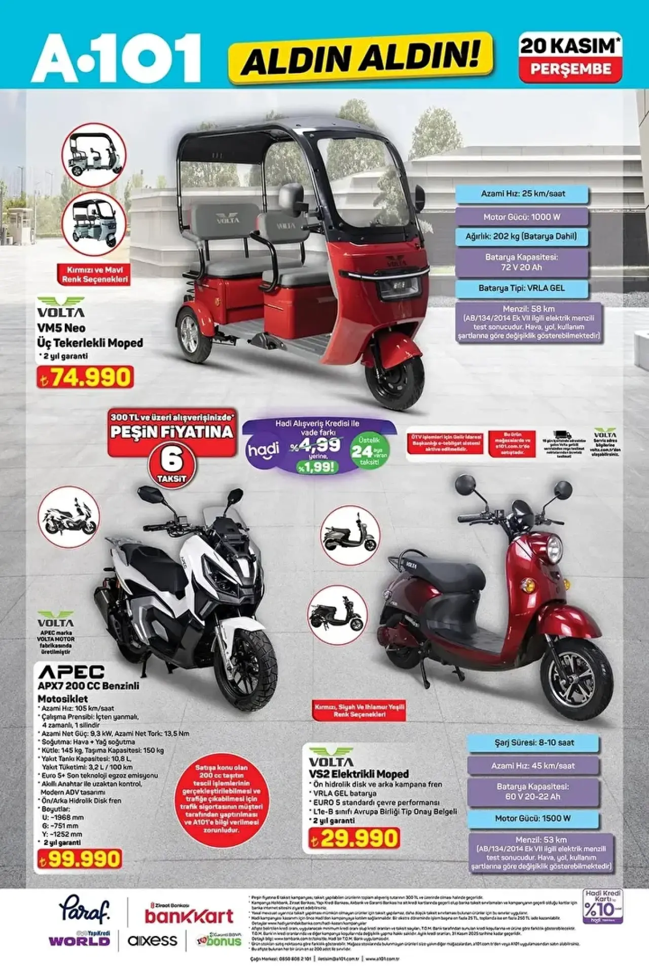A101, 20 Kasım Perşembe günü geçerli olacak yeni aktüel ürünler kataloğunu yayımladı. Haftanın en dikkat çekici ürünleri arasında çekme karavan ve 6500 Flat Tiny House modeli yer alıyor. Kamp ve karavan tutkunlarına hitap eden bu ürünlerin yanında televizyonlar, elektronik cihazlar, termoslar, dizel ısıtıcılar ve birçok teknoloji ürünü de indirime giriyor. "A101'de bu hafta neler var?" sorusu, katalogla birlikte yanıtını buldu.