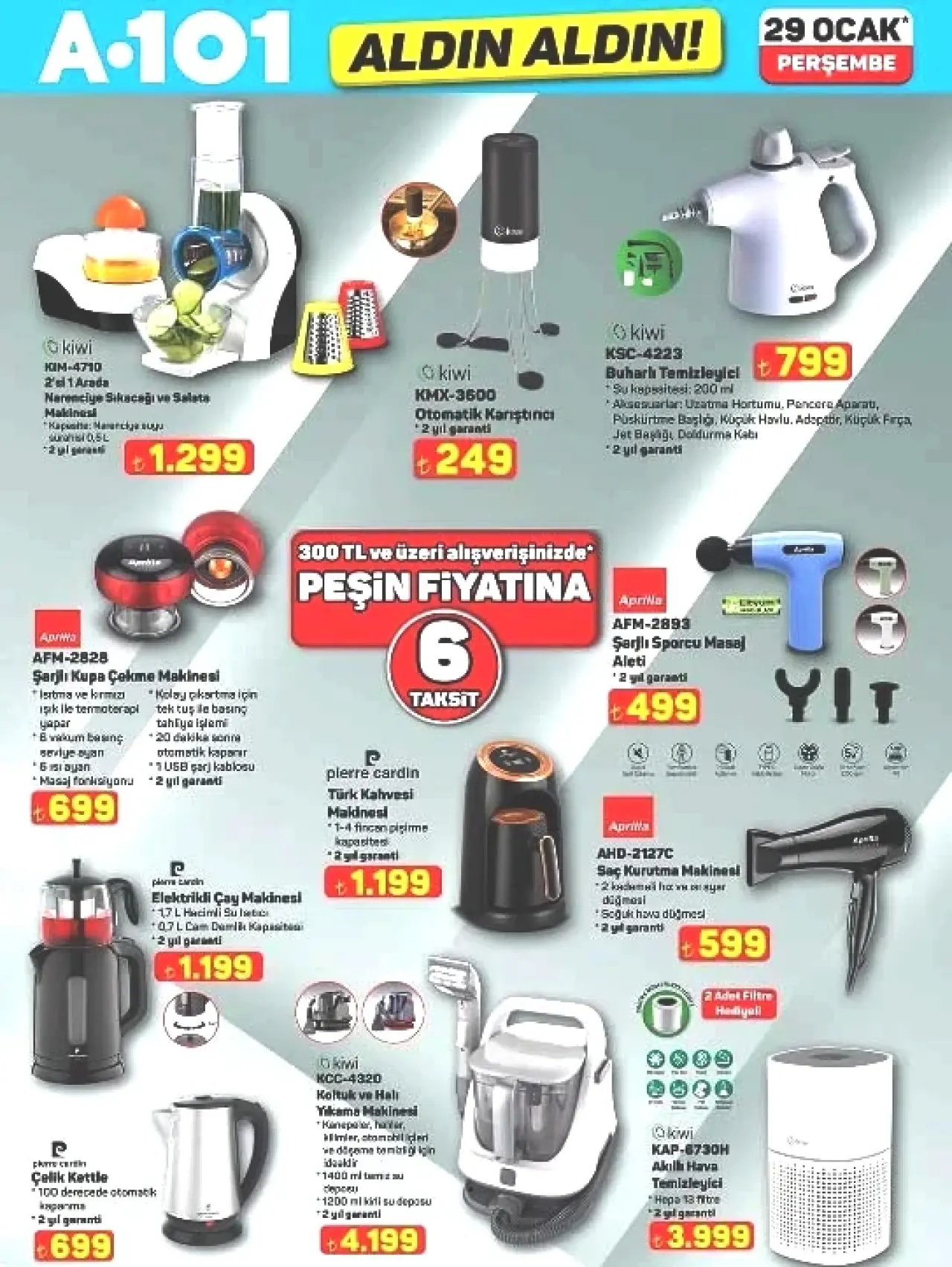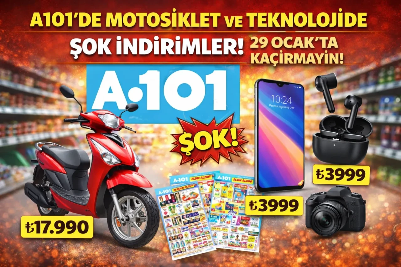 A101’in bu Perşembe, 29 Ocak 2026 tarihli afişiyle sunulacak olan ürünler detaylı bir şekilde açıklandı. A101 Aldın Aldın aktüel ürünler kataloğunda, dikkat çekici seçenekler arasında Stanley termoslar, 3’lü beyaz ankastre setler, karavanlar, sabit veya taşınabilir dizel ısıtıcılar, spor ekipmanları ve akıllı hava temizleyiciler bulunuyor. A101 indirim broşüründe 4.00 çekme karavan 329.000 TL, Stanley'in klasik model termosu 2,3 L 2.799 TL, akıllı hava temizleyici 3.999 TL, 2’si bir arada narenciye sıkacağı ve salata makinesi 1.299 TL, VT5 üç tekerlekli elektrikli moped 79.990 TL, katlanabilir şınav ve egzersiz tahtası 399 TL, buharlı temizleyici 799 TL, şarjlı kupa çekme makinesi 699 TL, 3’lü beyaz cam ankastre set 8.999 TL, metal ayaklı 3’lü zigon sehpa 999 TL, akıllı yüz takip gimbal ve tutaç 799 TL, 65 inç 4K Whale TV 22.999 TL, orta boy bavul 1.099 TL, döküm waffle tava 599 TL gibi ürünler müşterilerin beğenisine sunulacak.