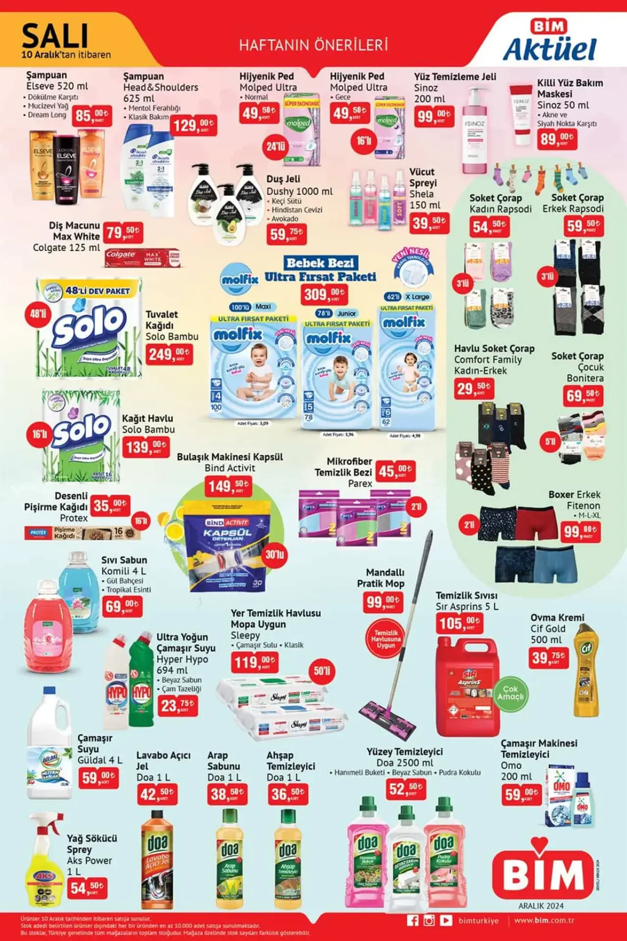 Bim aktüel 10 Aralık 2024 kataloğunun diğer sayfa detaylarında temel ihtiyaçlarınız için sizlerden gelen taleplere göre özenle seçili fırsat ürünleri Bim Salı Kataloğu içeriğinde epeyce yer aldığını söyleyebiliriz. İşte; Bim Market Salı günlerine özel Haftanın Önerileri etiketi ile hazırlanmış olan Salı kataloglarının en yenisi 10 Aralık 2024 Bim aktüel ürünler kataloğu içinde ki Elseve Şampuan 85 TL. Head & Shoulders Şampuan 129 TL. Molped Hijyenik Ped 49,50 TL. Solo Tuvalet Kağıdı 48’li dev paket 249 TL. Solo Kağıt Havlu 16’lı 139 TL. Sir Aspirins Temizlik Sıvısı Çok amaçlı 5 L temizlik sıvısı 105 TL. Yeni Bim Salı Kataloğu ile 17 Aralık 2024 tarihine kadar Bim Market mağazaları indirim reyonlarında geçerli ürünlerin yer aldığı 10 Aralık Bim Aktüel Ürünleri bu kadarla sınırlı değil tabi ki; Bu Salı Bimde sizlere sunulacak indirimli ürünlerinde;
