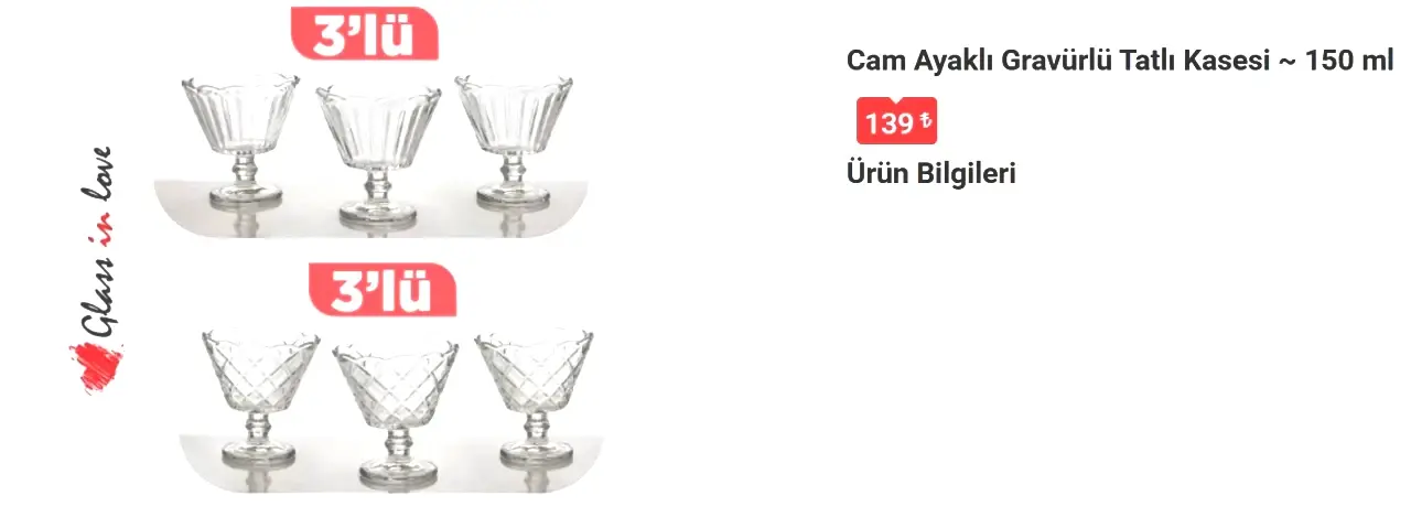 GLASS IN LOVE CAM AYAKLI GRAVÜRLÜ TATLI KASESİ 150 ML 3’LÜ
