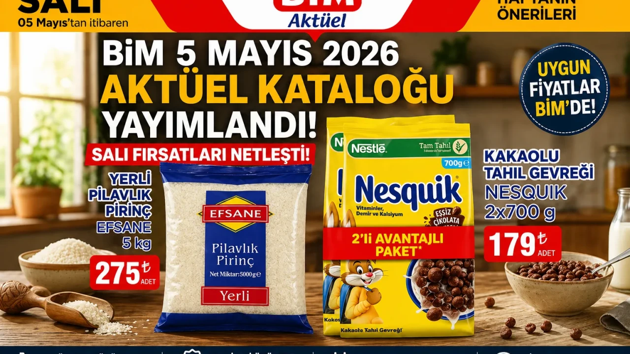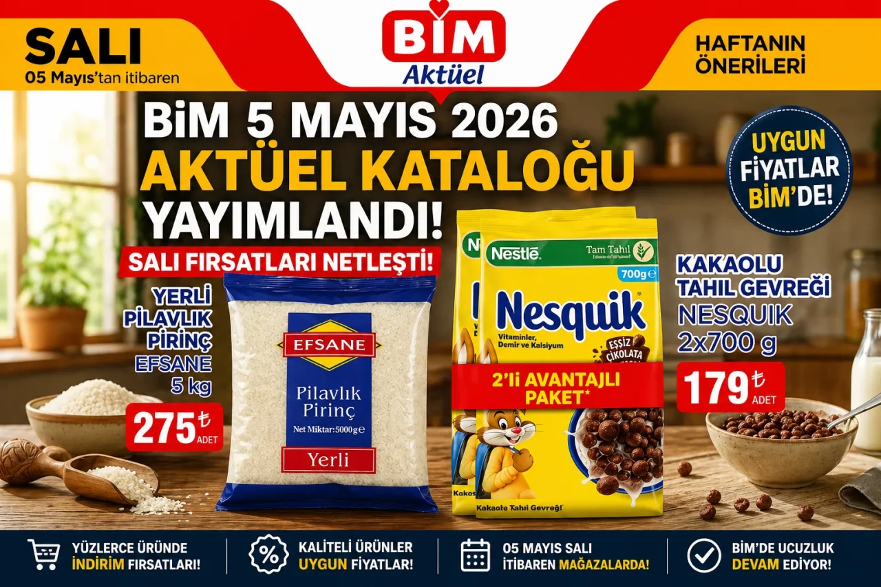Türkiye genelinde mağazaları bulunan BİM, 5 Mayıs 2026 Salı günü başlayacak aktüel ürünler kataloğunu duyurdu. Üç sayfadan ve yaklaşık 100 üründen oluşan kampanya kapsamında temel gıda, temizlik, kişisel bakım ve atıştırmalık kategorilerinde çok sayıda indirim yer alıyor. Salı günü raflara gelecek ürünler stoklarla sınırlı olarak satışa sunulacak.