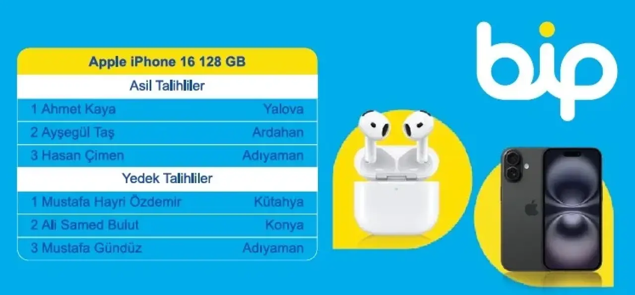 BİP, Öğretmenler Günü'ne özel düzenlediği hediye çekilişinin sonuçlarını duyurdu. Milli Piyango İdaresi onaylı kampanyaya katılanlar arasından yapılan çekilişle Apple iPhone 16 128 GB ve Aktif Gürültü Engelleme özellikli AirPods 4 kazanan talihliler açıklandı. İşte çekiliş sonuçları...