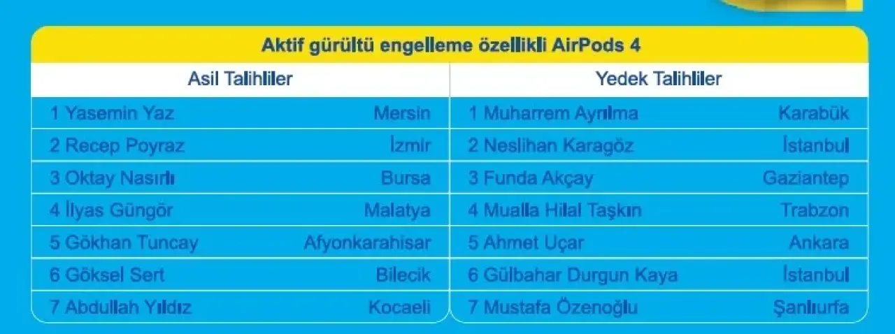 AİRPODS 4 (AKTİF GÜRÜLTÜ ENGELLEME) KAZANANLAR