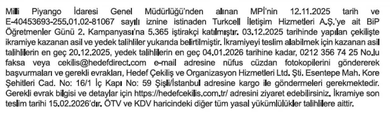 Milli Piyango İdaresi Genel Müdürlüğü'nden alınan MPİ'nin 12.11.2025 tarih ve E-40453693-255.01.02-81067 sayılı iznine istinaden Turkcell İletişim Hizmetleri A.Ş.'ye ait BİP Öğretmenler Günü 2. Kampanyası'na 5.365 iştirakçi katılmıştır. 03.12.2025 tarihinde yapılan çekilişte ikramiye kazanan asıl ve yedek talihliler yukarıda belirtilmiştir. İkramiyeyi teslim alabilmek için kazanan asıl talihlilerin en geç 20.12.2025, yedek talihlilerin en geç 04.01.2026 tarihine kadar, 0212 356 74 25 No.lu faksa veya [email protected] e-mail adresine nüfus cüzdan fotokopilerini göndererek başvurmaları ve gerekli evrakları, Hedef Çekiliş ve Organizasyon Hizmetleri Ltd. Şti. Esentepe Mah. Kore Şehitleri Cad. No: 16/1 İç Kapı No: 59 Şişli/İstanbul adresine kargo ile göndermeleri gerekmektedir. Gerekli evrak bilgisi ve detaylar için https://hedeffcekilis.com.tr/ adresini ziyaret edebilirsiniz. İkramiye son teslim tarihi 15.02.2026'dır. ÖTV ve KDV haricindeki diğer tüm yasal yükümlülükler talihlilere aittir.