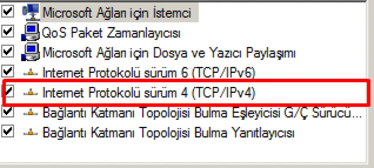 İnternet Protokolü sürüm 4 ü seçip Özellikler kısmına tıklıyoruz.İnternet Protokolü 6 henüz geçiş yapılmadı ancak çok yakında ip kalmadığı için Ipv6 ye geçiş yapacağız.