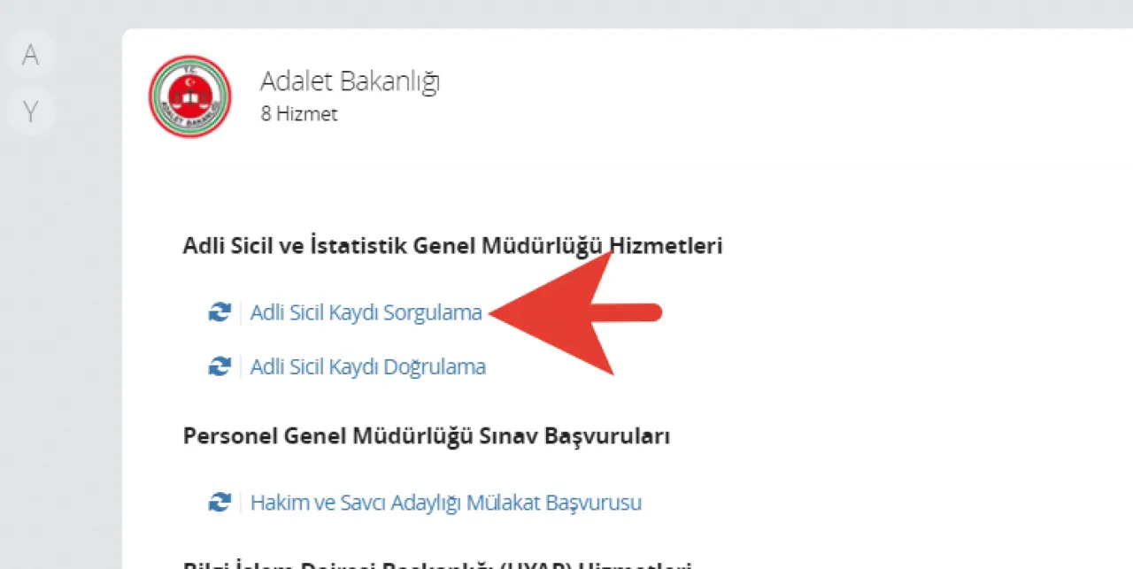 Arama sonuçları arasından "Sabıka Kaydı Sorgulama" veya "Adli Sicil Belgesi Sorgulama" hizmetini seçin.