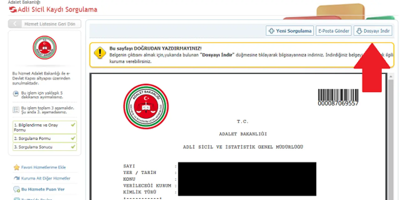 Ödeme işlemi tamamlandıktan sonra adli sicil belgenizi indirme veya yazdırma seçeneğiniz olacaktır. Belge genellikle PDF formatında sunulur ve hizmetten yararlandığınız anda erişime açılır.