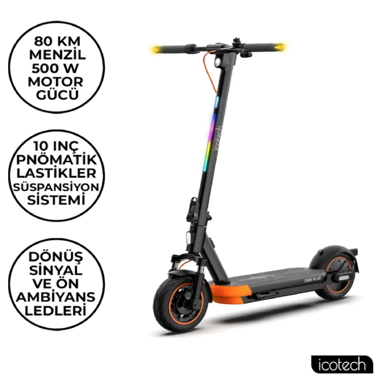 Icotech ES80 Plus, 80 km menzil değeriyle en uzun yolculuklarda dahi batarya endişesi yaşamadan kullanım vadeder. 500 W motor gücü, 25 km/s hızla sınırlandırılmış olsa da şehir içi yasal düzenlemelere uyumludur. Sinyal lambaları ve süspansiyon sistemi hem güvenliği hem de konforu artırır.