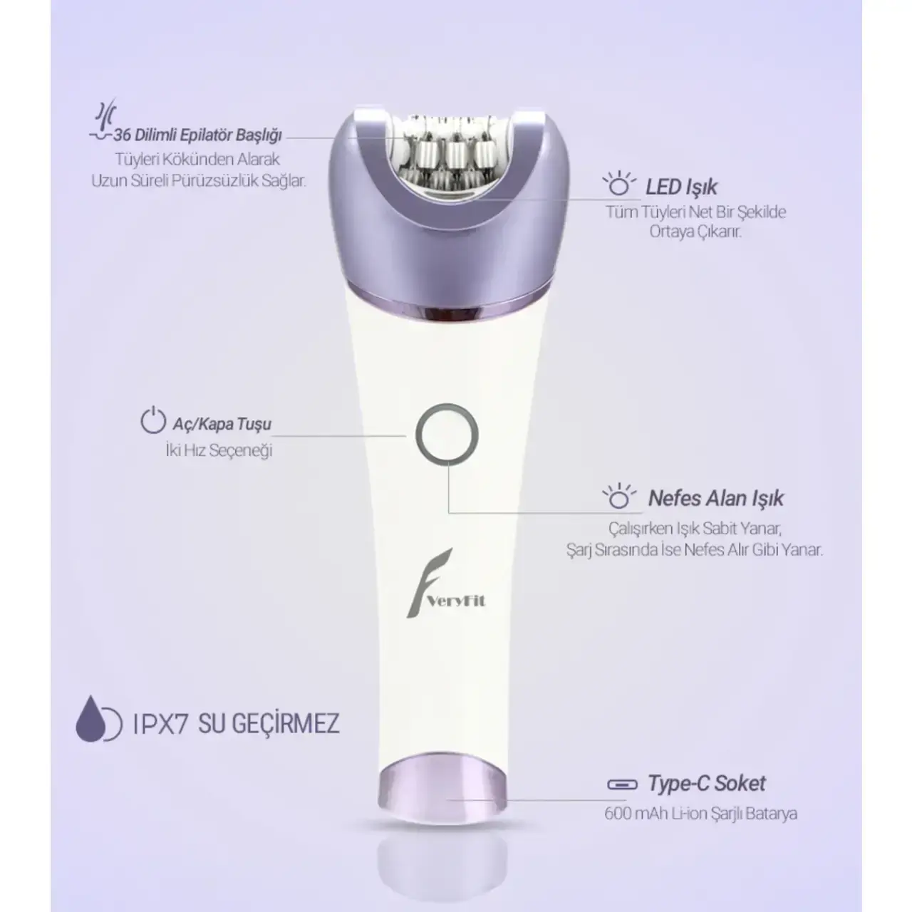 VeryFit 36 epilatör, 36 cımbızlı başlığı ve farklı ihtiyaçlara göre kolayca değiştirilebilen 6 başlığıyla dikkat çeker. Islak ve kuru kullanım imkanı sunan ürün, duşta veya normal ortamda konforlu epilasyon deneyimi yaşatır. Tıraş başlığı, masaj başlığı, ayak törpüsü gibi eklentileriyle çok yönlü bir kişisel bakım rutini sağlar. Şarjlı yapısı sayesinde 90 dakikaya kadar kablosuz kullanılabilir.