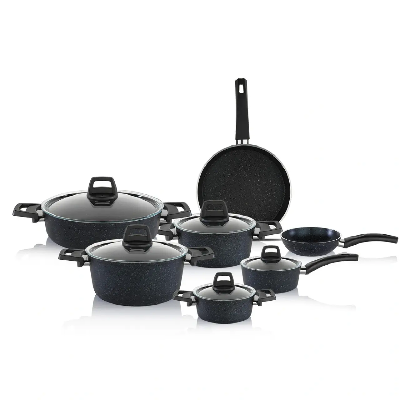 Schafer Dark Storm, 12 parçalık geniş set içeriğiyle kalabalık ailelerin veya çeşitli boyutlarda tencereye ihtiyaç duyanların beğenisini kazanır. Alüminyum granit kaplama gövdesiyle ısıyı eşit dağıtır.