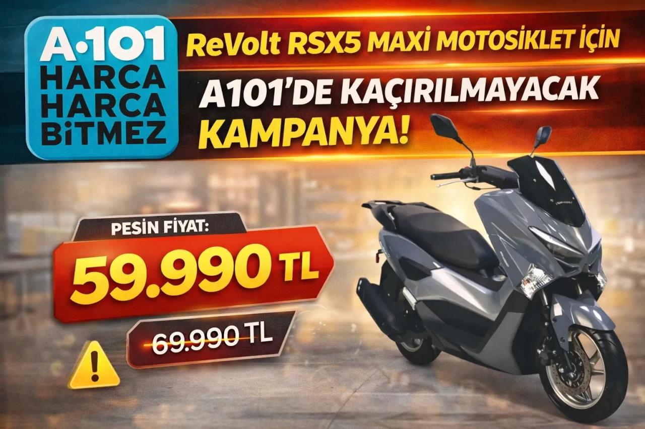 ReVolt RSX5 maxi motosiklet, çok yakında A101 marketlerinde yerini alacak. 125 cc veya 4 KW üzerindeki motorlar için sigorta zorunluluğu olduğunu hatırlatalım. Online satışa özel olarak tasarlanan yerli üretim motosikletin A101'deki satış fiyatı 59.990 TL olarak belirlendi. Aracın resmi satış fiyatı ise 69.990 TL olarak kaydedilmiştir. Eğer fiyat-performans odaklı bir motorsiklet arıyorsanız, önümüzdeki hafta başlayacak bu kampanyayı incelemenizi öneririz. Ayrıca, motosiklet kredi kartlarıyla taksitli olarak da satın alınabilmektedir. Yeni kampanyalar hakkında bilgi vermeye devam edeceğiz.