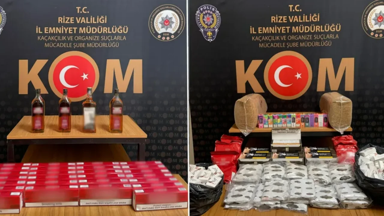Rize İl Emniyet Müdürlüğü'nden yapılan açıklamada, Kaçakçılık ve Organize Suçlarla Mücadele Şube Müdürlüğü ekiplerince il genelinde yapılan çalışmalarda; 28 bin 300 adet doldurulmuş makaron, 1466 paket kaçak sigara, 553 adet elektronik sigara tütünü, 109 adet elektronik eşya, 63 kilogram kaçak tütün, 52 litre etil alkol, 32 şişe kaçak içki, 32 şişe sahte içki, 21 adet muhtelif eşya, 7 adet cep telefonu ve 2 şişe alkol aromasının ele geçirildiği bildirildi.