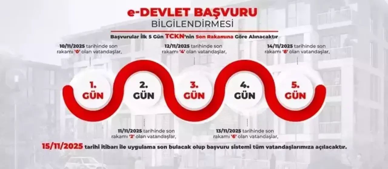 Yoğunluğu dağıtmak amacıyla, ilk 5 gün, T.C. kimlik numarasının son hanesine göre kademeli başvurular yapılacak. Ardından da uygulama tüm vatandaşlara açık olacak.