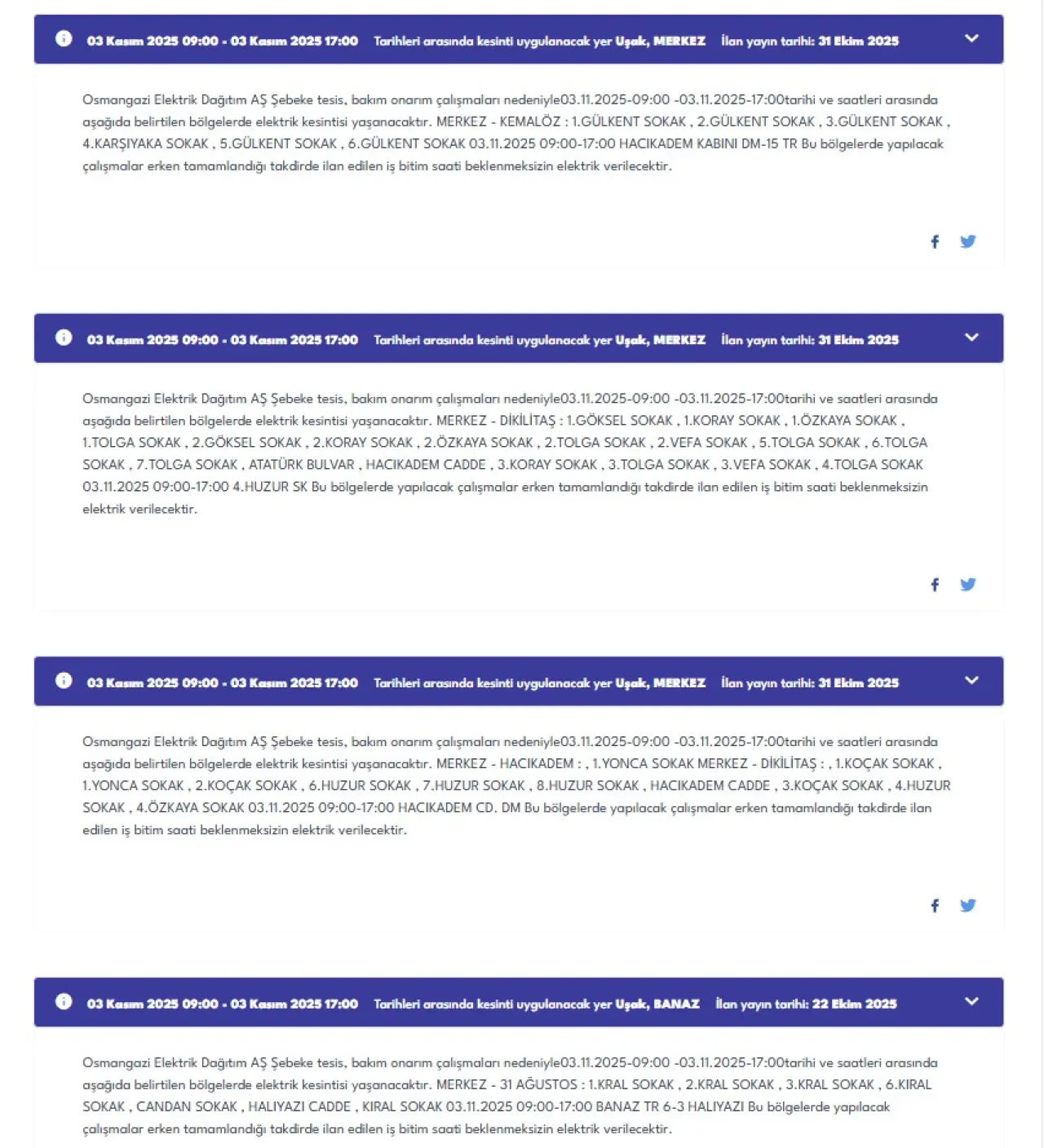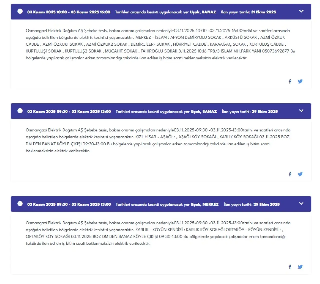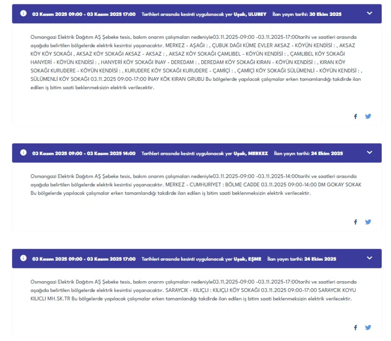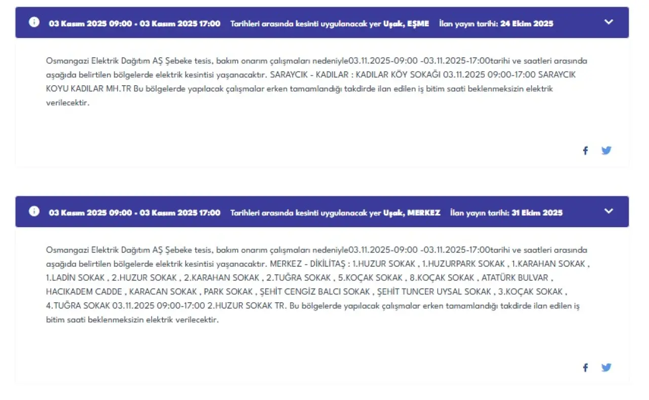 Osmangazi Elektrik Dağıtım AŞ tarafından yapılan duyurulara göre, 3 Kasım 2025 Pazar günü Uşak'ın birçok bölgesinde planlı elektrik kesintisi uygulanacak.