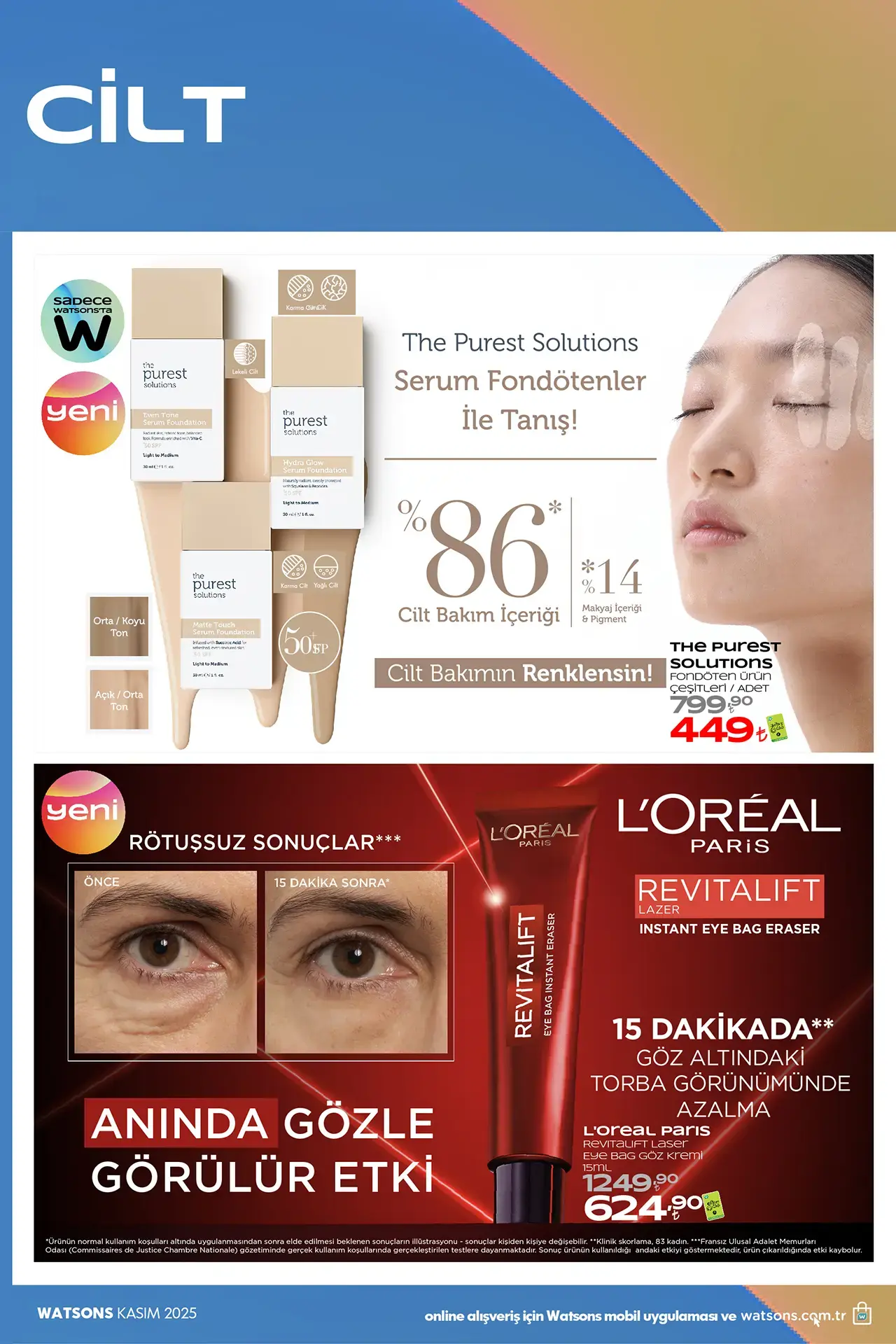 Watsons indirimleriyle alışverişin sınırlarını zorlamak da mümkün ve üstelik bunu yapmak piyasa fiyatlarına göre de oldukça makul durumda. Biliyorsunuz ki yılın en büyük alışveriş şöleni Watsons 11.11 için geri sayım başlarken Watsons Kasım 2025 kataloğu büyük gösteri öncesindeki son ve en heyecanlı provayı da sunuyor. Bu dönem güzelliğin kodlarını yeniden yazarak ışıltının sadece cildimize sürdüklerimizde değil, aynı zamanda yiyip içtiklerimizde ve hissettiklerimizde gizli olduğunu kanıtlıyor. Güzellik anlayışını bir üst boyuta taşıyan VITA CEEL gummy takviyeleriyle cildinizi, saçınızı ve tırnaklarınızı içeriden besleyen gizli kahramanları çağırmanızı sağlıyor. Bu katalog yani Watsons Kasım 2025 kataloğu; bilimsel inovasyonun en keskin örneklerini (The Purest Solutions, L’Oréal) doğallığın en saf haliyle (Bade Natural, Naturals by Watsons) bir araya getirerek, her güzellik anlayışına hitap eden zengin bir evren yaratıyor. Sunulan her bir kampanya yaklaşan 11 Kasım’ın görkemini müjdelerken, bilinçli tüketicilere ihtiyaçlarını en akıllıca şekilde karşılama ve güzellik rutinlerini kusursuzlaştırma imkanı tanıyor. Bu bir indirim kataloğundan çok daha fazlası demiştim. Bu, kendine değer veren, yeniliği seven ve güzelliği 360 derece yaşayan herkes için yazılmış bir manifestodur sevgili ziyaretçim. İşte bu sebeple aktuel-urunler.com adresinde Watsons kataloğunu inceliyor ve okuyorsun. Kataloğu da sayfa devamına ekliyoruz, indirimleri de orada ayrıca vurguluyoruz. Sen de bizlere “YORUM” kanalıyla ulaşarak katalog hakkında görüşlerini bildirebilirsin. Yılın son Watsons kataloğunda görüşene dek, güzel günler dilerim.