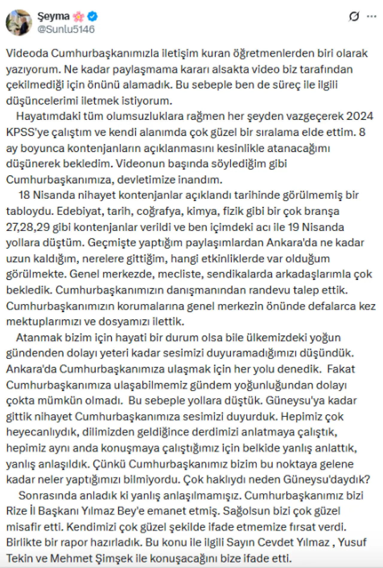 Videoda yer alan öğretmen adaylarından birisi daha sonra sosyal medya hesabından söz konusu videoyu ve yaşananları anlattı. Erdoğan ile görüşme yapmasına kadar başından geçen olayları anlatan öğretmen ‘Sonrasında anladık ki yanlış anlaşılmamışız’ dedi.