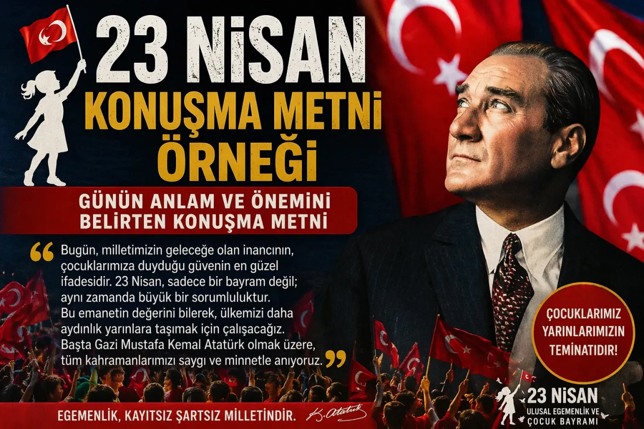 Türkiye Büyük Millet Meclisinin açılış yıldönümü olan 23 Nisan Ulusal Egemenlik ve Çocuk Bayramı ulu önder Mustafa Kemal Atatürk tarafından dünya çocuklarına armağan edildi. Bu kutlu günde okullarda yapılacak kutlama konuşmaları hazırlanmaya başladı. İşte 23 Nisan günün anlam ve önemini belirten konuşma metni örneği..