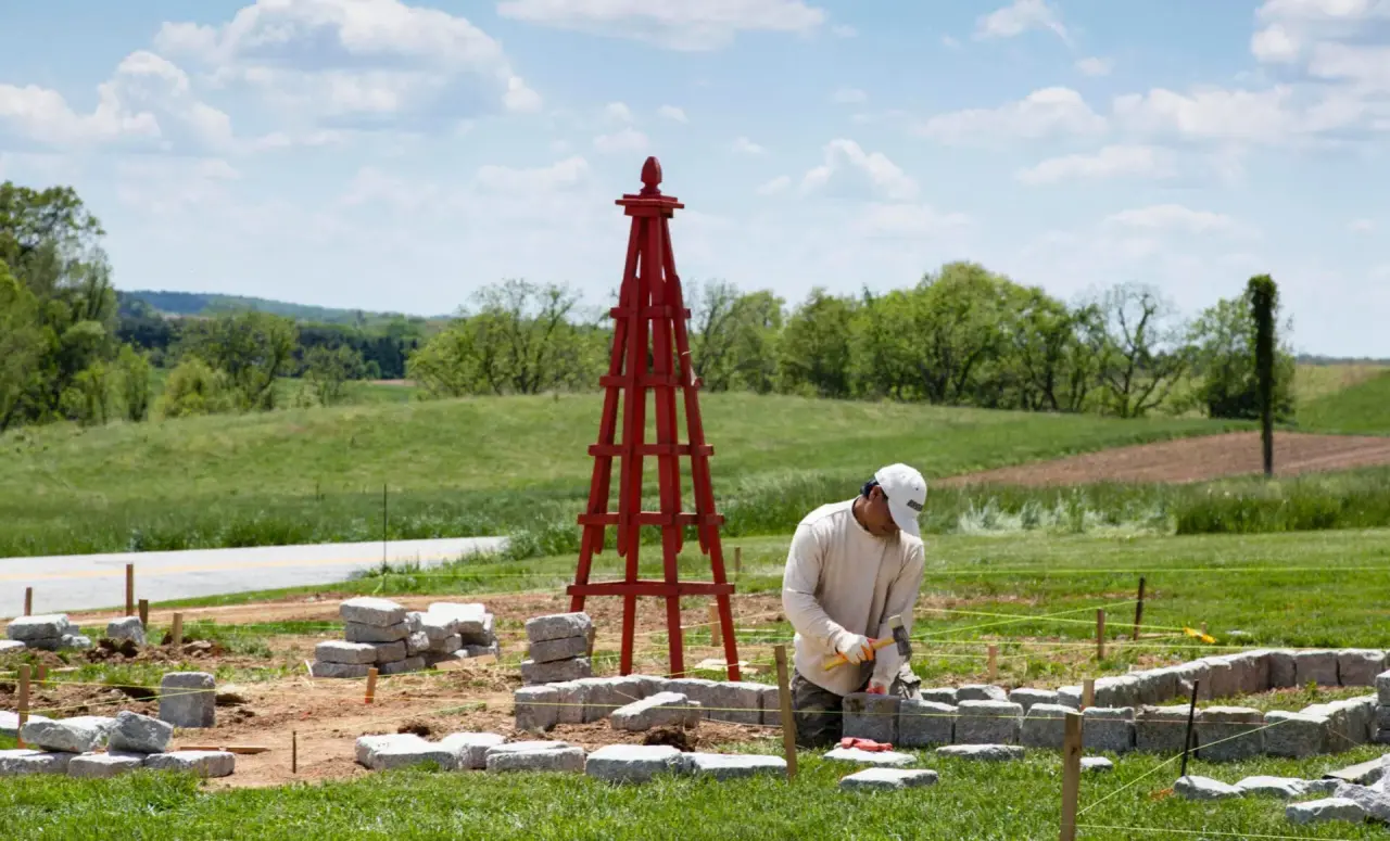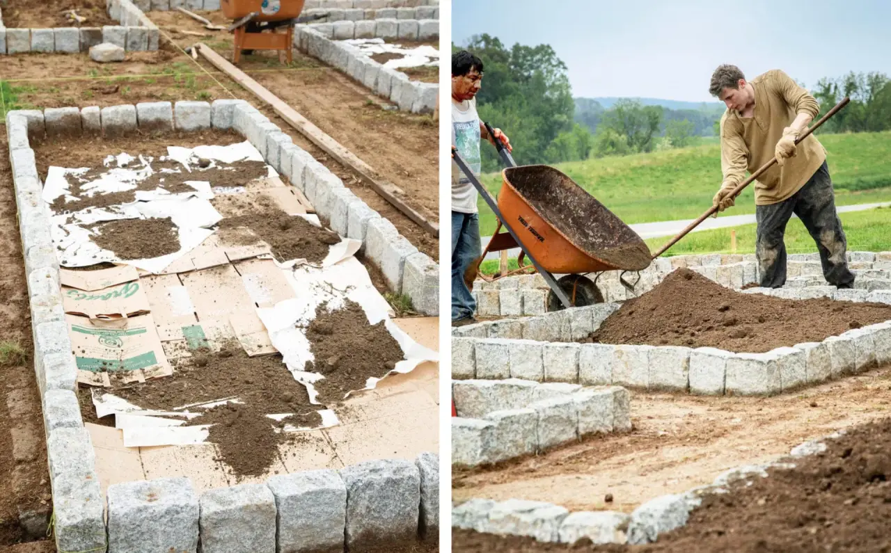 Helen, tasarımını çizdikten sonra kurulum için bir peyzaj mimarı tuttu. Helen'in planlarını izleyerek lazer su terazisi kullanarak yatak düzenini ölçtü ve istenen kenar yüksekliğini işaretlemek için köşe kazıkları ve ip kullanarak bir duvarcı hattı oluşturdu. Ardından bir hendek kazmaya ve taşları yerleştirmeye başladı ve her bloğu düzeltmek için toprak ekleyip çıkardı. Don kabarmasının endişe verici olduğu daha soğuk iklimlerde, TOH peyzaj müteahhidi Jenn Nawada, blokları yerleştirmeden önce 15 cm derinliğe kadar kazıp 5-7 cm derinliğinde 5 cm'lik kırma taştan bir taban döşemeyi öneriyor.