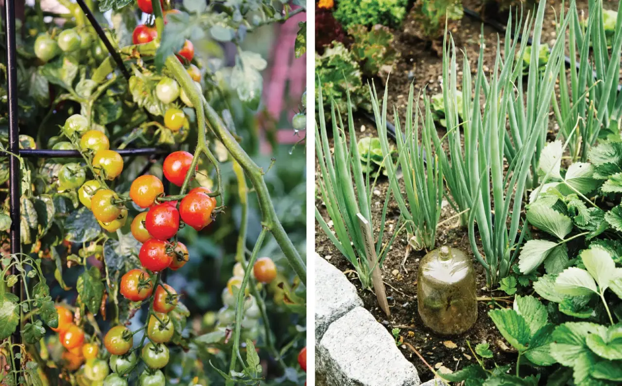 Yenilebilir bitkiler arasında yetişen çiçekler, sadece göz alıcı değil. Helen'in domateslerinin etrafındaki kadife çiçekleri, kök kemiren nematodlar gibi böcekleri uzaklaştırmak için oradayken, çıplak alanları örtmek için kullandığı bölgesel sardunyalar Japon böceklerini uzaklaştırıyor. Helen ayrıca, "çiçeklerin büyük hasatlar elde etmek için olmazsa olmaz olan tozlayıcıları çektiğini" de ekliyor.