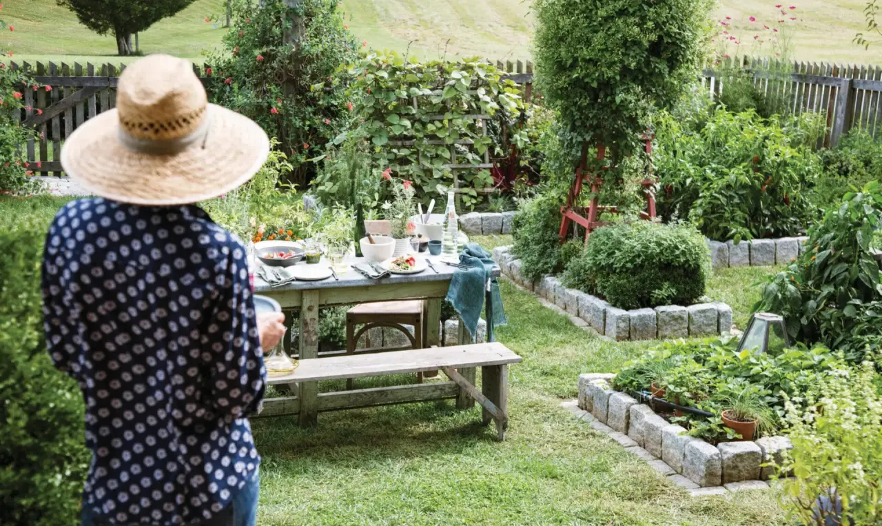 Ancak sonunda, taze toplanmış ürünlerden oluşan kendine ait bir stoku olan Helen, bir mutfak bahçesi için planlar yapmaya başladı . Profesyonel bir yaşam tarzı fotoğrafçısı olarak, neyi sevdiğini bilecek kadar çok yayına layık ev ve bahçe fotoğrafı çekmişti. Ortaya çıkan bahçe -simetrik tarhları, kırmızı tonları ve göz hizasında kafes bitkileriyle- açıkça tasarıma meraklı birinin damgasını taşıyordu. Üstelik verimli de oldu. Helen'in hatırladığı gibi, "İlk yıl o kadar çok sebzemiz vardı ki, bir sepet alıp akşam yemeğini toplamaya gidebiliyordum."
