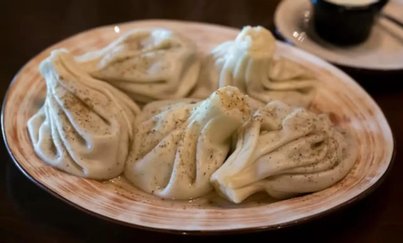 Baharatlı et suyuyla dolu khinkali, elle yeniyor. Doğru hazırlanmış khinkali, ilk ısırıkta içindeki suyu hissettiriyor.