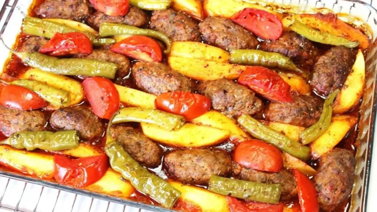 Isıya dayanıklı bir kaba köfteleri ve patatesleri yerleştirin.Hazırladığınız sosu patates ve köftelerin üzerinde gezdirin.