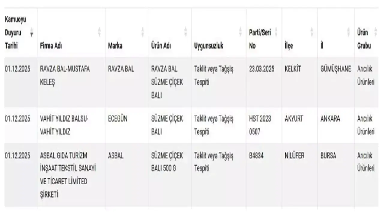 Tarım ve Orman Bakanlığı, 1 Aralık itibarıyla hileli gıda ürünleri listesinde yeni bir güncelleme yaparak kapsamı genişletti. Yapılan denetimlerde üç ayrı markaya ait süzme çiçek balı ürünlerinde taklit ve tağşiş uygulamalarına rastlandı.