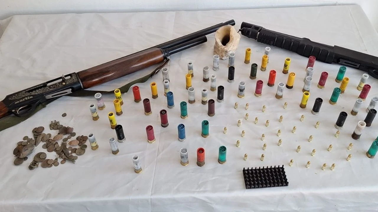 Ev ve eklentilerde yapılan aramalarda; 2 adet ruhsatsız av tüfeği, 62 adet av tüfeği fişeği, 1,5 gram yasaklı madde, 32 adet 7,65 mm çapında tabanca fişeği, 83 adet tarihi eser niteliğinde olduğu değerlendirilen çeşitli obje ve 1 adet tarihi taş parçası ele geçirildi.
