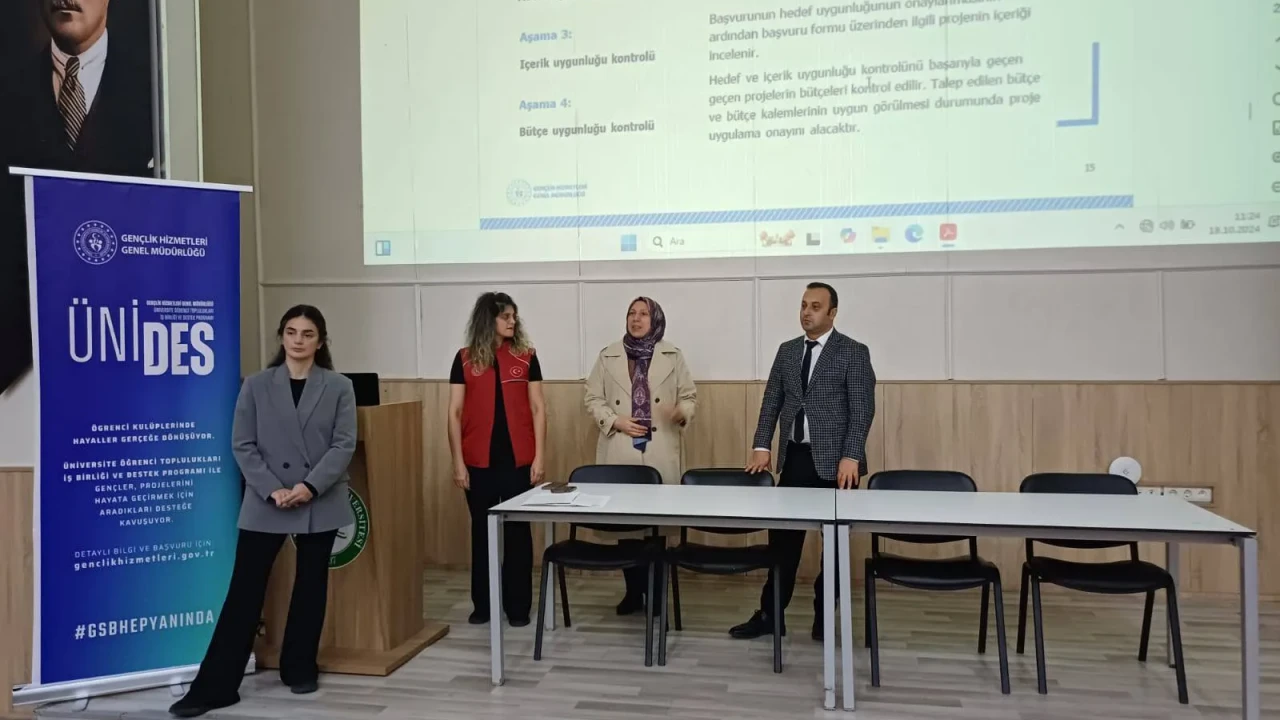Fakülte konferans salonunda gerçekleştirilen etkinlikte, gençlere projeler, fırsatlar ve başvuru süreçleri hakkında kapsamlı bilgilendirmeler yapıldı. Program kapsamında öğrencilerin fikirlerini projelere dönüştürebilmeleri için rehberlik sağlandığı vurgulandı.