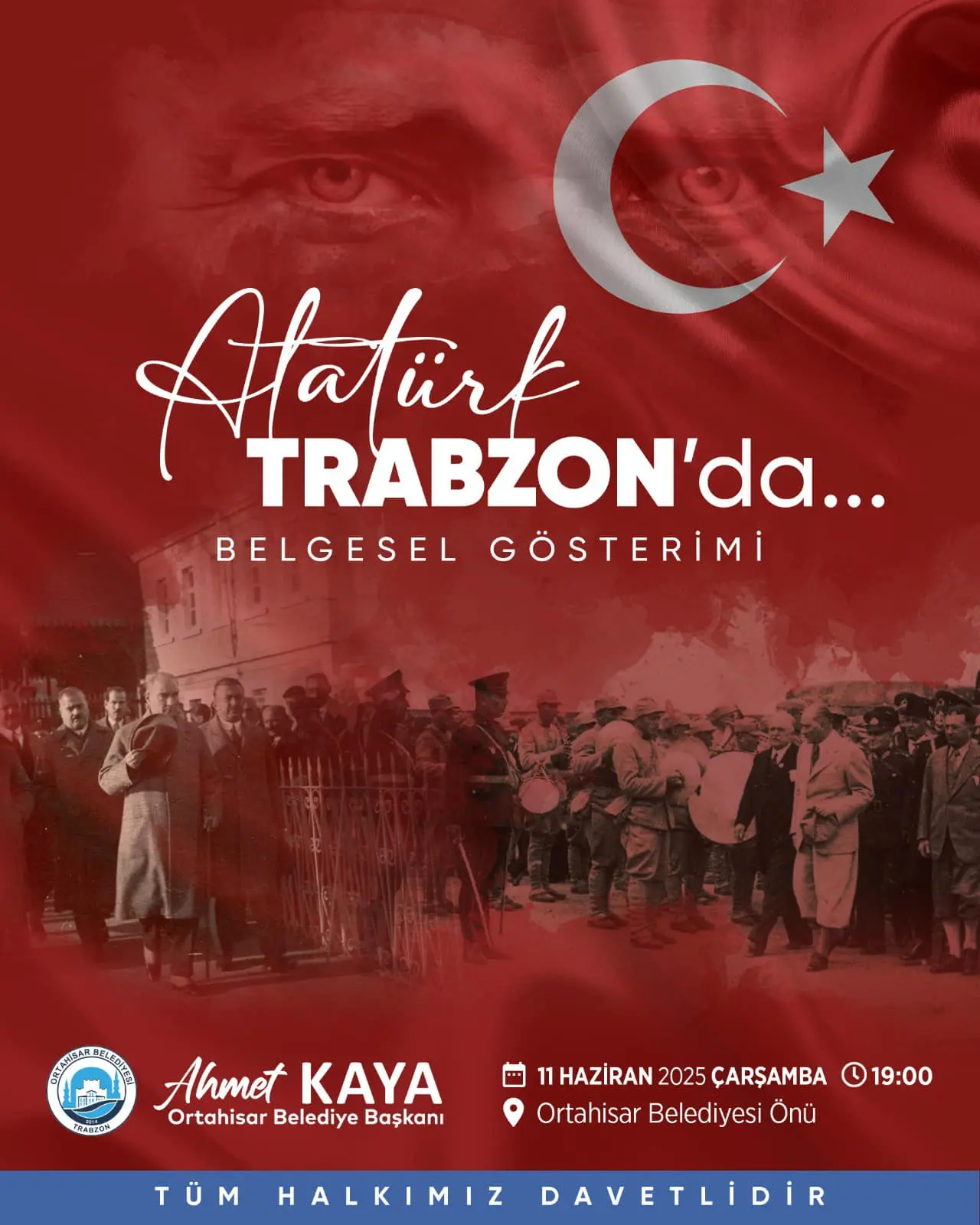Trabzon Ortahisar Belediyesi, Cumhuriyetimizin kurucusu Gazi Mustafa Kemal Atatürk'ün Trabzon'a son gelişinin 88. yıl dönümünü büyük bir gururla kutlamaya hazırlanıyor. Bu anlamlı günde, Başkan Ahmet Kaya tarafından özel olarak hazırlatılan "Atatürk Trabzon'da" adlı belgeselin ilk gösterimi gerçekleştirilecek.
