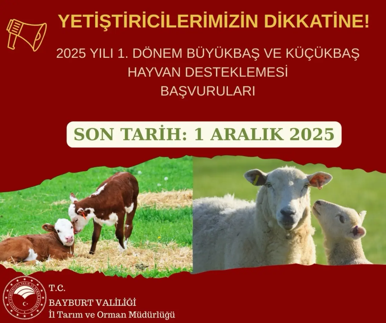 Aydıntepe İlçe Tarım Müdürlüğü, 2025 yılı hayvancılık desteklemelerinden yararlanmak isteyen üreticilere yönelik önemli bir hatırlatma yayımladı. Buzağı, kuzu ve oğlak desteklemeleri için başvuru süreçlerinin sürdüğü belirtilerek son tarihin 1 Aralık 2025 olduğu vurgulandı.