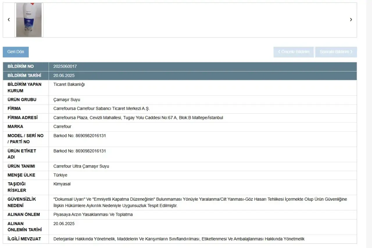 Ticaret Bakanlığı, Türkiye'nin önde gelen perakende zincirlerinden Carrefour Sabancı Ticaret Merkezi A.Ş. tarafından satışa sunulan bir çamaşır suyu ürünü için toplatma kararı aldı. Bakanlık, Güvensiz Ürün Bilgi Sistemi (GÜBİS) üzerinden yaptığı duyuruda, ürünün ciddi güvenlik eksiklikleri taşıdığını ve tüketiciler için risk oluşturduğunu belirtti.
