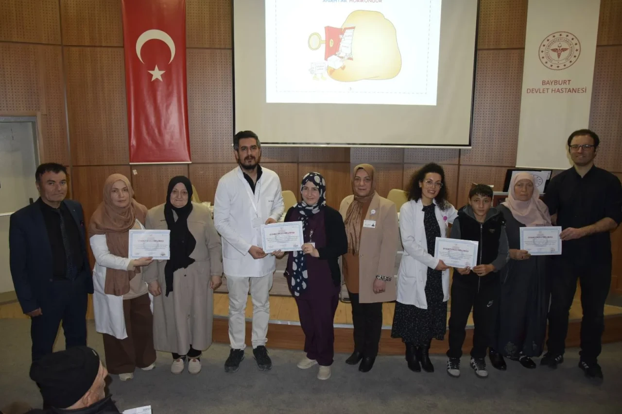 Bayburt Devlet Hastanesi bünyesinde yürütülen Diyabet Okulu eğitim programı, hasta ve hasta yakınlarının yoğun ilgi ve katılımıyla tamamlandı. Diyabetle yaşam konusunda farkındalık oluşturmayı amaçlayan eğitimlerde, katılımcılara hastalığın yönetimi, sağlıklı beslenme, ilaç kullanımı ve yaşam tarzı düzenlemeleri hakkında kapsamlı bilgiler aktarıldı.