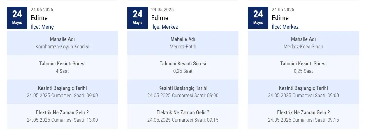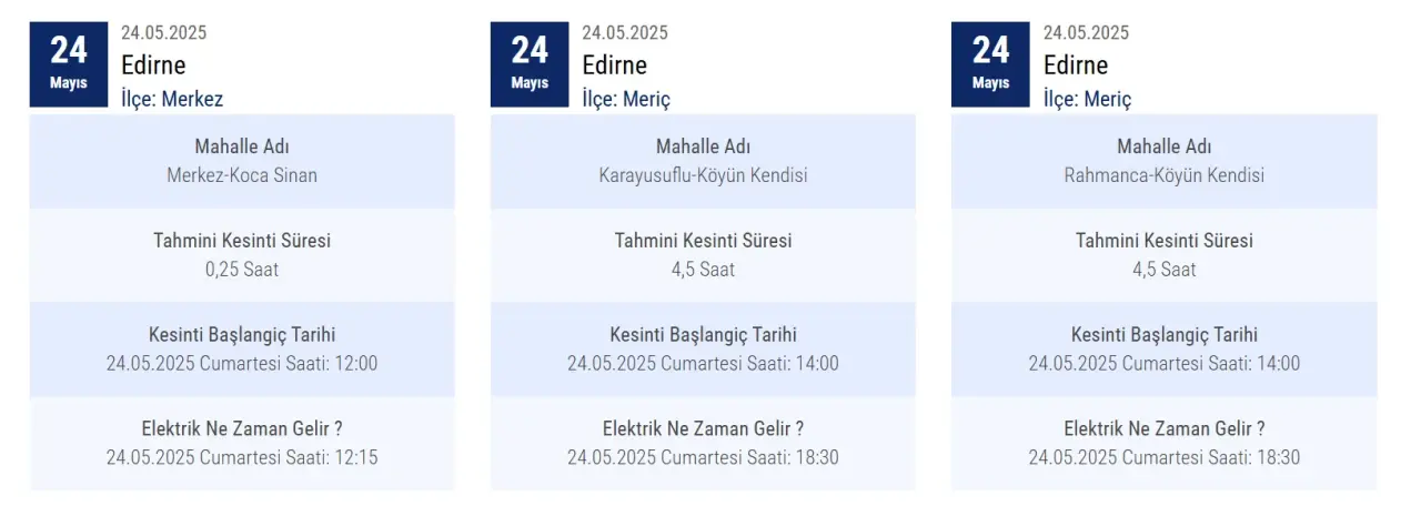 Edirne’de 24 Mayıs 2025 Cumartesi günü planlı elektrik kesintileri kapsamında birçok ilçe ve mahallede elektrik kesintisi yaşanacak. Trakya Elektrik Dağıtım A.Ş. (TREDAŞ) tarafından yapılan açıklamaya göre, bakım, onarım ve enerji nakil hattı çalışmaları kapsamında bazı mahallelerde belirli saat aralıklarında elektrik verilemeyecek. Kesintiden etkilenecek bölgeler ve saat bilgileri kurumun resmi internet sitesinden paylaşıldı. Vatandaşların kesinti süresince gerekli tedbirleri almaları istendi. Peki Edirne'de hangi ilçe ve mahallelerde elektrik kesintisi olacak? TREDAŞ elektriğin yaptığı duyuruları sizler için haberimizde derledik.