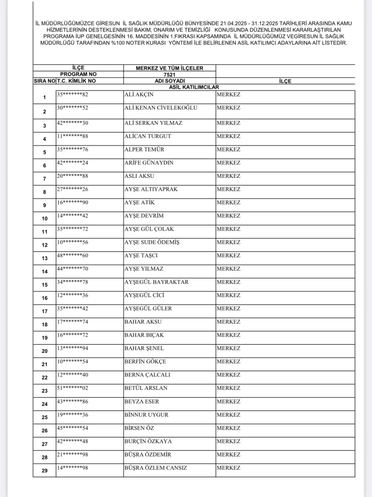 Giresun İŞKUR ve Giresun İl Sağlık Müdürlüğü iş birliğiyle gerçekleştirilen kura sonucunda, asil katılımcı listesi netleşti.