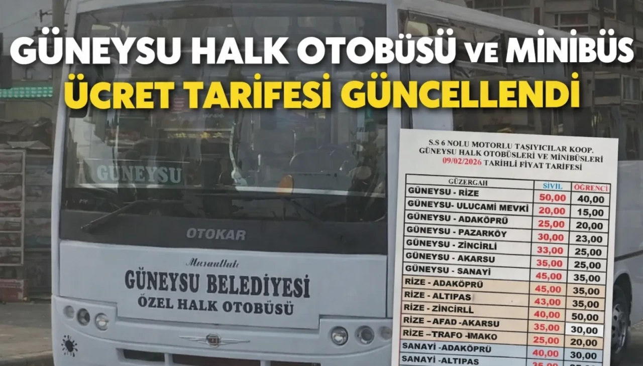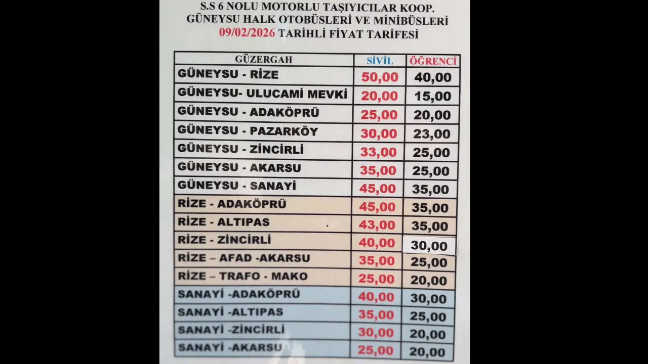 Yeni tarifeye göre Güneysu–Rize hattında sivil yolcu ücreti 50 TL, öğrenci ücreti ise 40 TL olarak belirlendi. Güneysu ile Ulucami, Adaköprü, Pazarköy, Zincirli, Akarsu ve Sanayi güzergâhlarında da ücretler mesafeye göre güncellendi.