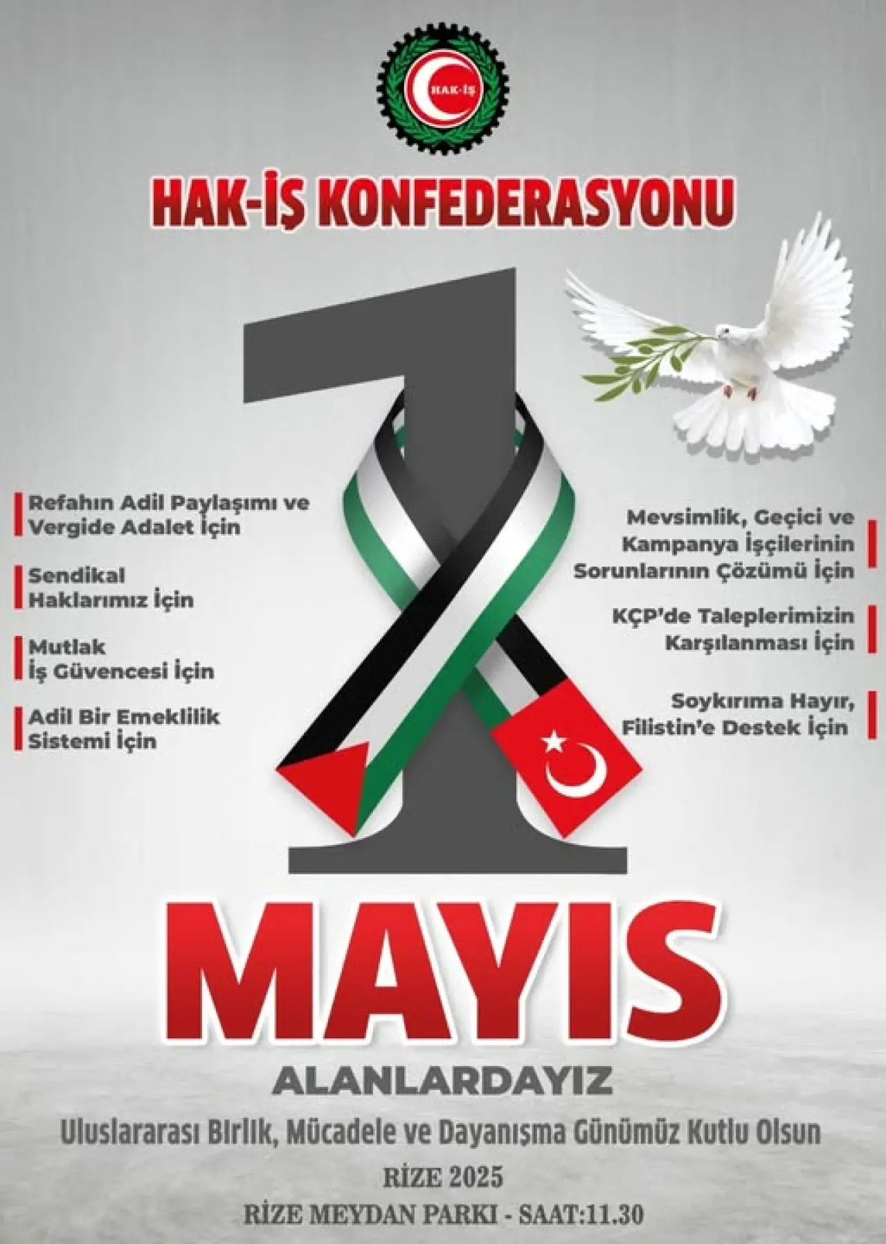 “HAK-İŞ Konfederasyonu Yönetim Kurulu olarak, her yıl ayrı bir ilde 1 Mayıs kutlama kararımız çerçevesinde bu yıl 1 Mayıs Uluslararası Birlik Mücadele ve Dayanışma günü kutlamalarını Rize 15 Temmuz Demokrasi ve Cumhuriyet Meydanında saat 11.30’da kitlesel olarak gerçekleştirecektir.