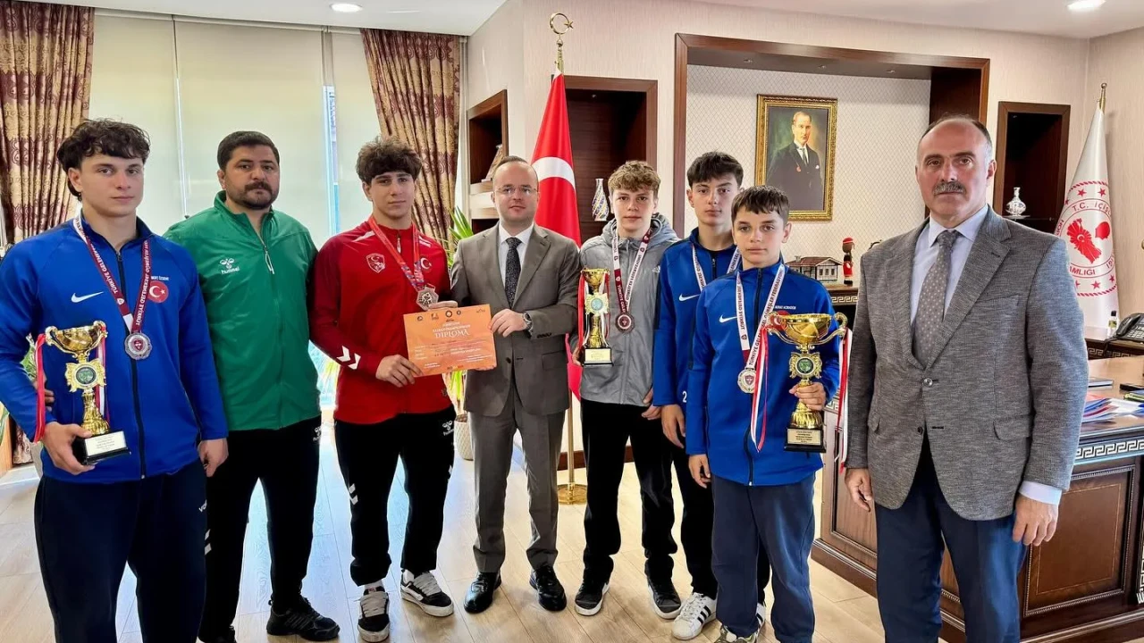 Romanya’nın Cluj-Napoca kentinde düzenlenen U15 Balkan Şampiyonası’nda üçüncülük elde eden İsmet Anıl Yaz ile Erzurum İspir Üzümbağı’nda gerçekleştirilen Tarihi Altın Kemer Karakucak Güreşleri’nde dereceye giren sporcular, Hopa Gençlik ve Spor İlçe Müdürü Mehmet Zafer Yazıcı ve Güreş Antrenörü Tuncay Dayanç eşliğinde Hopa Kaymakamı Abdullah Arslantürk’ü makamında ziyaret etti.