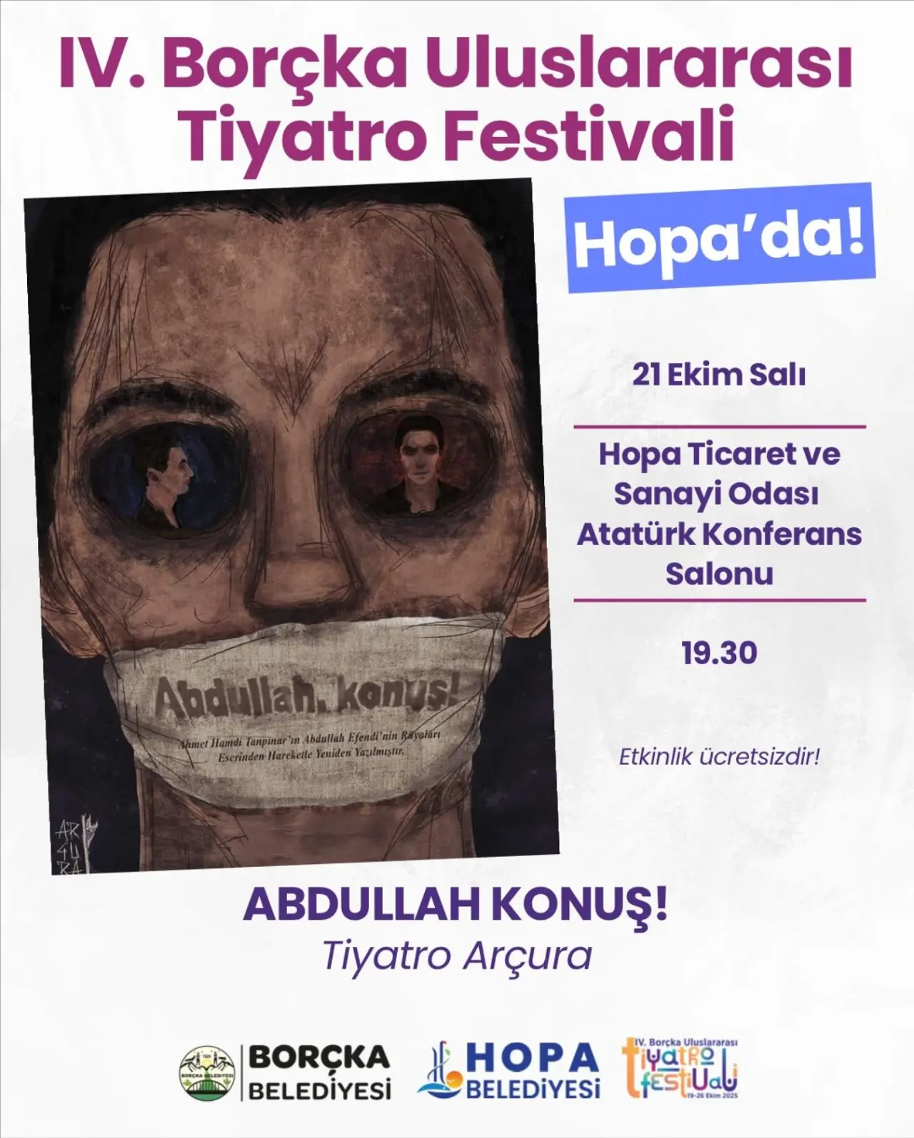 Borçka Uluslararası Tiyatro Festivali'nde, Tiyatro Arçura'nın "Abdullah Konuş!" oyunu Hopa'da sahnelenecek. Ahmet Hamdi Tanpınar'ın "Abdullah Efendi’nin Rüyaları" eserinden ilham alan oyun, 21 Ekim'de ücretsiz olarak sunulacak. Hopa Belediyesi bu etkinliği destekliyor.