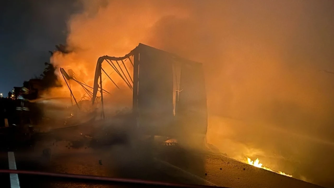 Yangında, TIR'ın dorsesi tamamen yandı.