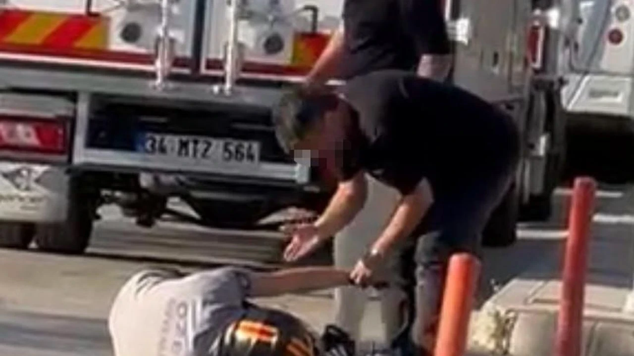 Uyarı ve ağır cezalara rağmen trafikte yaşanan şiddet olayları durmak bilmiyor. İddialara göre, yol verme anlaşmazlığı nedeniyle başlayan tartışma, kısa sürede yumruklu kavgaya dönüştü. Aldığı darbelerle yere düşen motosiklet sürücüsü, otomobildeki iki kişinin tekmeli saldırısına maruz kaldı. Dehşet anları, olay yerindeki vatandaşlar tarafından kaydedildi.
