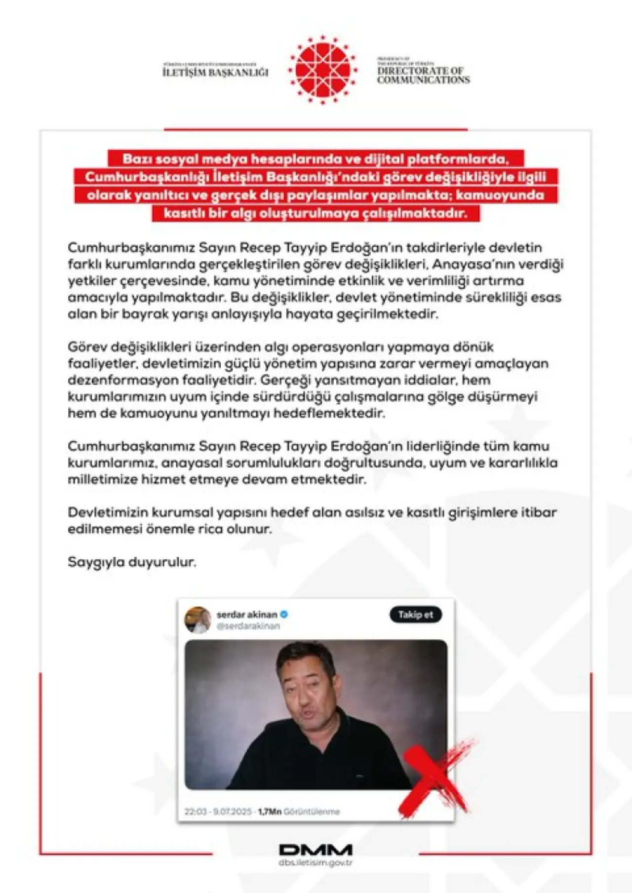 Açıklamada, devlet yönetiminde sürekliliğin esas alındığına dikkat çekilerek, yapılan değişikliklerin kurumlar arası koordinasyonu güçlendiren ve hizmet kalitesini yükseltmeyi hedefleyen bir "bayrak yarışı" anlayışı çerçevesinde gerçekleştirildiği belirtildi. Görev değişiklikleri üzerinden yürütülen algı operasyonlarının, güçlü devlet yapısına zarar verme niyetli dezenformasyon çabaları olduğu kaydedildi.