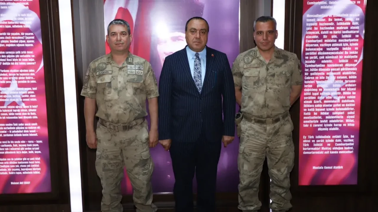 Erzurum’un Narman ilçesinde görev süresini tamamlayarak ilçeden ayrılan İlçe Jandarma Komutanı J.Asb.Kd.Bçvş. Adem Paksoy ile göreve yeni başlayan J.Asb.Kd.Bçvş. Haşim Özdemir, Narman Belediye Başkanı Aydemir Adem Kınalı’yı makamında ziyaret etti.