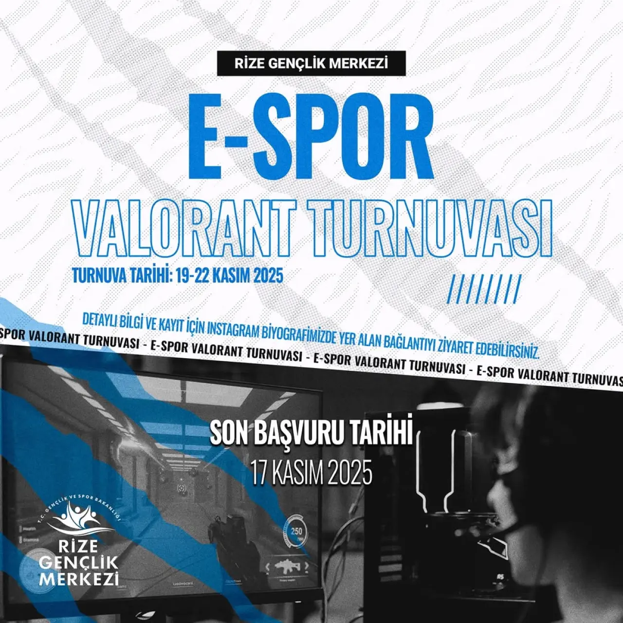 Rize Gençlik Merkezi, gençlere yönelik e-spor faaliyetleri kapsamında Valorant Turnuvası düzenliyor. 19–22 Kasım 2025 tarihleri arasında gerçekleştirilecek turnuvaya katılmak isteyen takımlar için başvurular 17 Kasım 2025 tarihine kadar kabul edilecek.