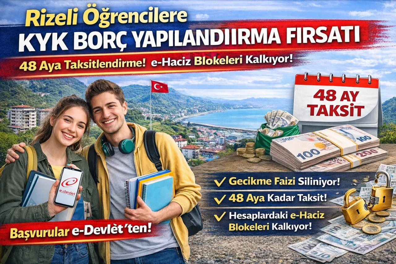 Rizeli öğrenciler için KYK borçları 48 aya taksitlendiriliyor, gecikme faizleri siliniyor ve e-Haciz blokeleri kaldırılıyor. Başvurular e-Devlet’ten yapılacak.