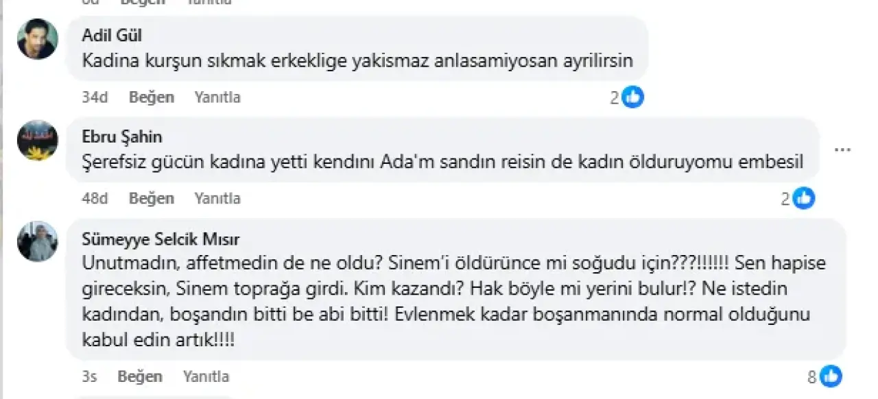 Cinayetin ardından Ali Eren S.’nin tehdit içerikli paylaşımına yüzlerce yorum yapıldı. Bir kullanıcı, “Unutmadın, affetmedin de ne oldu? Sinem’i öldürünce mi soğudu için? Hapise gireceksin, Sinem toprağa girdi. Evlenmek kadar boşanmanın da normal olduğunu kabul edin artık” sözleriyle tepki gösterdi.