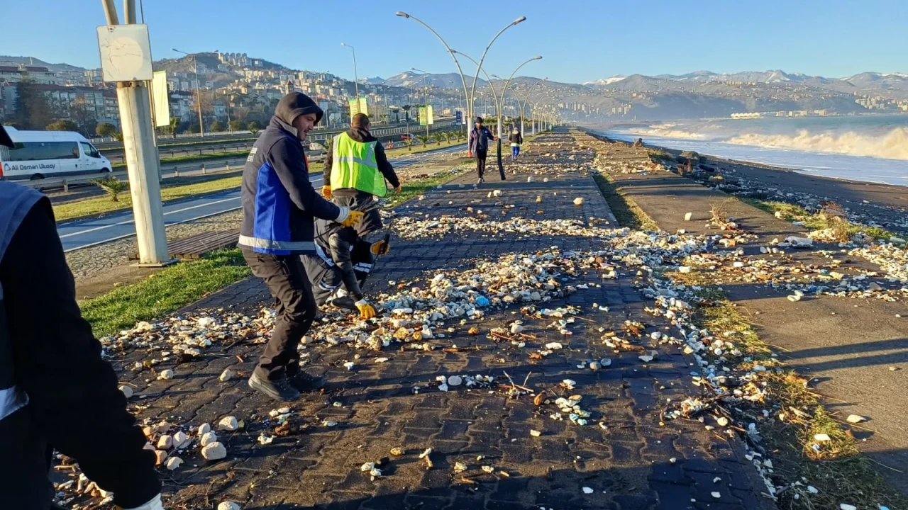 Trabzon'da şiddetli fırtına sonrası Ayasofya sahilindeki olumsuzluklara belediye ekipleri hızlı müdahale etti. Deniz taşmasıyla biriken atıklar temizlenerek yol güvenliği sağlandı ve sahil yolu yeniden ulaşıma açıldı. Belediyeden, olumsuz hava koşullarına karşı tedbirlerin devam edeceği bildirildi.