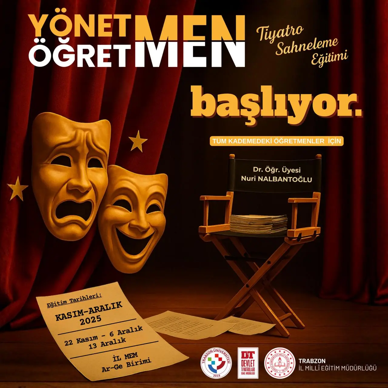 Trabzon İl Milli Eğitim Müdürlüğü ve Trabzon Üniversitesi iş birliğiyle başlatılan “Yönetmen Öğretmen” projesi, öğretmenlere tiyatro eğitimi sunarak sanatsal yönlerini güçlendirmeyi hedefliyor. Katılım için başvurular 5 Kasım 2025'e kadar alınacak.